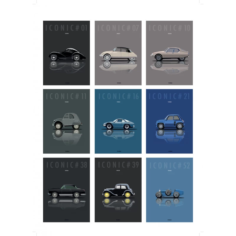 Le coq vous à déniché une affiche regroupant 9 voitures françaises iconiques, cette affiche sur des gammes de couleurs oscillant entre les nuances de gris et le bleu mets en avant des voitures de 1924 à 1980.