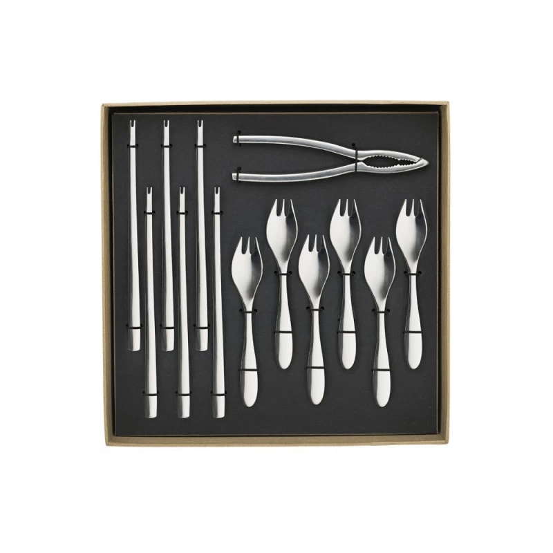 Ce coffret est composé simplement de 6 fourchettes à huîtres, de 6 curettes à crustacés et d’une pince à crustacés. Les différentes pièces de ce coffret sont fabriquées en acier inoxydable. Ces couverts sont conçus pour vous faciliter la préparation et la dégustation de vos produits de la mer préférés, en allant du crabe aux huîtres, en passant par le homard.