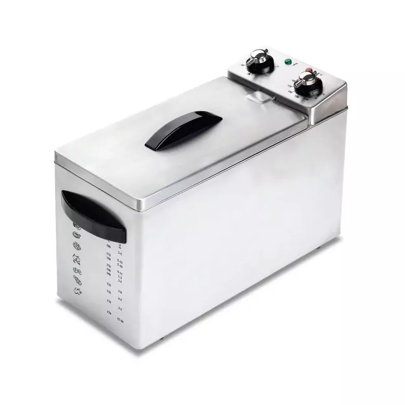 - Équipement : panier à poignée amovible, thermostat de régulation très précis (0-180 °C), thermostat à bulbe inox double sécurité en cas de surchauffe ou d’insuffisance d’huile, minuterie, bouton chrome, voyants de contrôle.