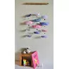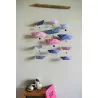 Un beau mobile mural pour enfant assez girly avec ses tons roses et violets. Les bateaux sont fait avec des papiers à motifs « ethniques » : flèches, plumes, chevrons…