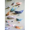 Un joli mobile pour éguailler la chambre d’un enfant. Il est constitué de bateaux en papier à motifs animaliers et végétaux dans des tons scandinaves : rose pêche, jaune moutarde, bleu navy et bleu ciel.