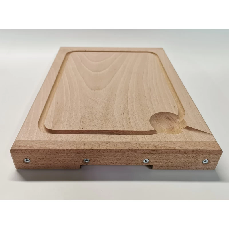 Fabriquée à partir de bois de hêtre de 38 mm d’épaisseur, c’est une planche à découper haut de gamme que nous vous proposons aujourd’hui. Confectionnée à partir d’un seul morceau de bois sur la partie coupe, la planche ne risque pas de se fissurer en deux comme les planches du commerce, attention toutefois à bien la laver à la main et à l’essuyer rapidement pour éviter que le bois ne travaille trop.