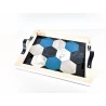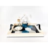 La structure du plateau est en bois de sapin vernis, les poignées sont en cuir de vachette beige. Les 10 sous verres sont en carton bois avec un vinyle PVC de couleur bleu canard, rose, jaune moutarde ou bleu menthe.