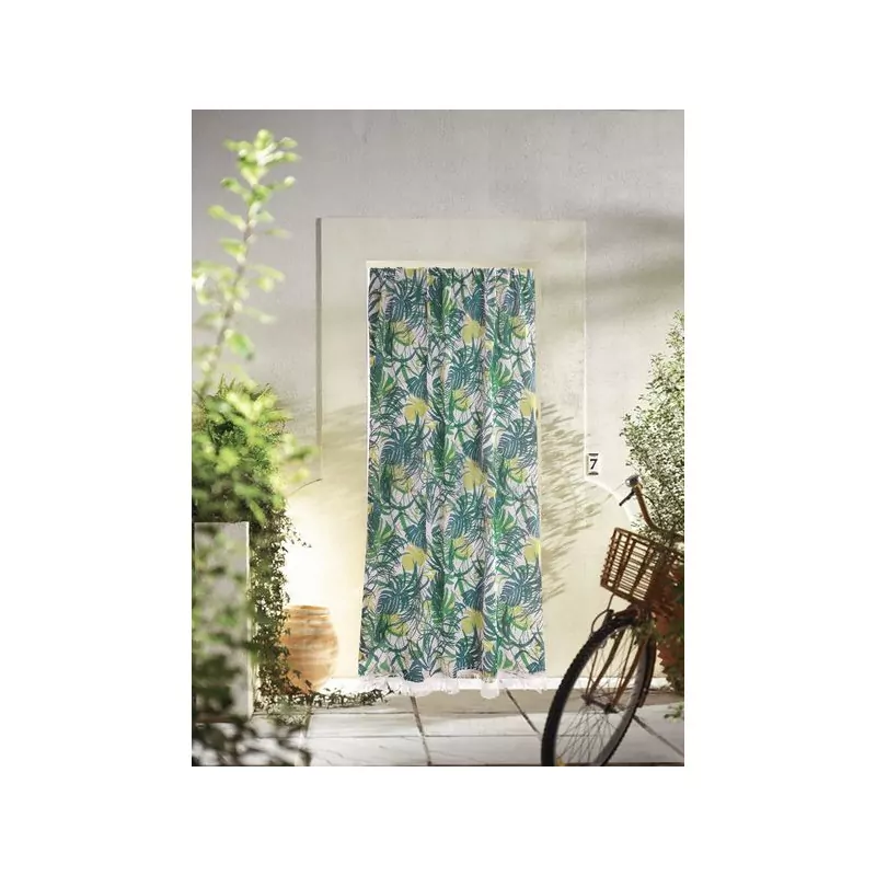 Un rideau de porte ou rideau portière avec un imprimé qui rappelle la jungle avec des feuillages de différentes couleurs, dans les tons vert et jaune. C’est un maillage fin qui laisse passer la lumière. Il est parfait pour une porte afin de laisser passer l’air tout en gardant de l’intimité.