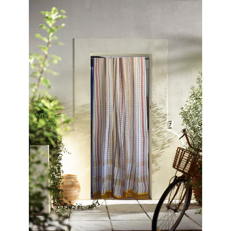 Un rideau simple et coloré qui apportera un peu de couleur à votre décoration d’intérieur avec ses rayures dans les tons jaunes, rouge, blanc et bleu. Grâce à son ourlet que vous devrez réaliser, ce rideau portière s’adaptera facilement à toutes les portes et fenêtres. Il est tissé dans un maillage extra fin de fibre naturelles et recyclées qui laisse passer la lumière. Information importante : il ne passe pas en machine à laver pour un entretien facile bien mettre les rideaux au pressing.